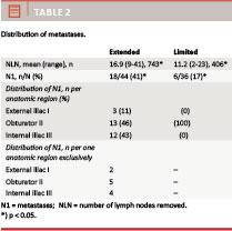 Table 2 shows the distribution of metastases. The number of patients with N1 was 18 (41%) for e-PLND and six (17%) for versus L-PLND (p = 0.03). The mean number of lymph nodes (NLN) removed was 16.9 (range 9-41) for e-PLND and 11.2 (range 1-23) for L-PLND (p = 0.001). N1 ranged between one and five nodes per patient for all patients and 1-2 positive nodes detected outside the limited region per patient. Six of 44 patients (13.6%) had N1 exclusively outside the region related to the limited dissection technique.