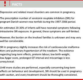 The use of serotonine reuptake inhibitors (SRIs) is increasing among Danish pregnant women. This systematic review addresses the potential adverse effects on the foetus and child of maternal SRI medication. The literature indicates a slightly increased risk of cardiovascular malformations and persistent pulmonary hypertension of the new-born, while evidence regarding the risk of preterm labour, low birth weight, low Apgar score, prolonged QT interval and miscarriage is less clear. An estimated 20-30% of infants will have neonatal symptoms following intrauterine SRI exposure. The symptoms may be caused by SRI withdrawal, toxicity or their overlap, but symptom aetiology basically remains controversial. The infants may exhibit neurological, gastrointestinal, autonomic, endocrine or respiratory symptoms. Although the symptoms are self-limited, the families may be seriously affected. In general, studies do not address this important aspect. Evidence concerning long-term effects is surprisingly sparse and many studies have important methodological limitations. However, present evidence does not convincingly indicate detrimental long-term effects. Until sufficient safety studies have been carried out, SRI must be used with caution in pregnancy and every treatment of the pregnant woman should be thoroughly considered.