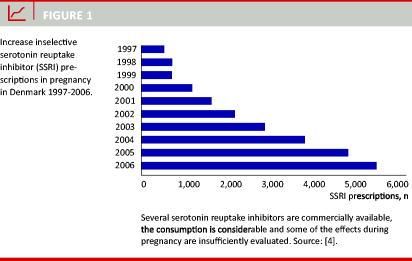 Pregnant women commonly develop inconvenience or disorders in the depressive spectrum [1-3] and the treatment of choice is often serotonin reuptake inhibitors (SRIs), a group of drugs that can be divided into selective serotonin reuptake inhibitors (SSRIs) and serotonin norepinephrine reuptake inhibitors (SNRIs). The SRIs are also prescribed for other conditions such as anxiety, panic attacks or obsessive compulsive disorder. In Denmark, the number of SSRI prescriptions for pregnant women increased tenfold from 1997 to 2006 (Figure 1) [4]. The following years SRI consumption among young Danish women aged from 15 to 44 years increased by another 12%, which indicates that the use of these drugs may still be increasing during pregnancy [5].