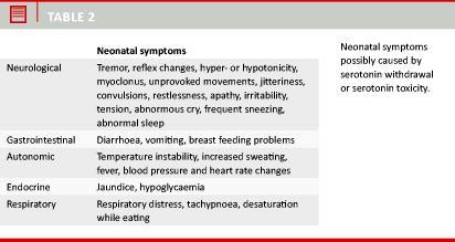 Different definitions of the neonatal symptoms observed following intrauterine SRI exposure have been proposed and terms like "neonatal behavioural syndrome", "serotonin toxicity", "withdrawal", "abstinence syndrome", "serotonin syndrome", "poor neonatal adaptation", "serotonergic excess", "discontinuation syndrome", "transient neonatal symptoms" and "serotonergic central nervous system adverse effects" are widely used. Here we use the neutral term "neonatal symptoms" to avoid indicating a certain cause (see below). An overview considering typical symptoms is presented in Table 2.