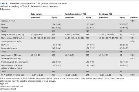 The majority of the patients in the study cohort were female (Table 1). The mean age was 47 years (± SD: 9.2), median weight was 129 kg and median BMI was 44.05 kg/m2. A total of 26.6% of the patients experienced no to mild joint symptoms and 76.4% experienced moderate to intense joint symptoms. A total of 56.7% of the patients were on the labour market and 43.3% were outside the labour market. At baseline, the mean QoL score was –0.34 (± SD: 1.1). The two exposure groups varied significantly on the variables of age (p = 0.02), working status (p = 0.02) and QoL (p = 0.02). The group with partial remission of T2D had a mean QoL score at baseline of –0.26, and those who still had T2D reported a mean QoL at baseline of –0.57.