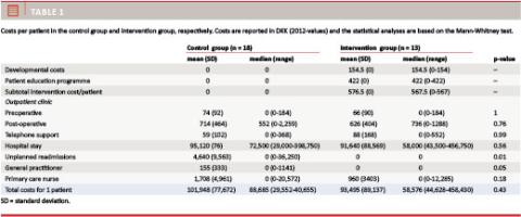 The overall costs were based on a per-patient average and showed no significant difference between the groups associated with the introduction of patient education (Table 1). The total costs showed a difference between the two groups equivalent to a mean cost reduction of 8,453 DKK/patient in favour of the intervention group. However, this difference was not significant.