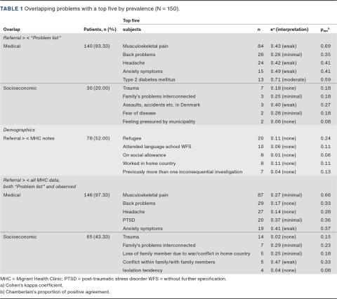 METHODS A retrospective cross-sectional study was conducted on 150 patients referred to the Migrant Health Clinic (MHC), Odense University Hospital, Denmark. The study was based on a full “Problem list” that was co-produced with the patient. Cohen’s kappa (κ) and Chamberlain’s proportionate positive agreement (pppa) were calculated for the medical and socioeconomic problems described in the referrals and MHC notes, respectively.