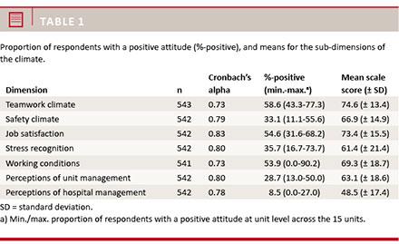 Table 1 presents the scale statistics reporting %-positive and mean scale statistics, whereas the proportion of respondents with a positive attitude to the climate (%-positive) per unit is displayed in Figure 1.