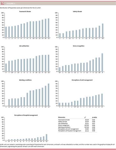 For all scales except job satisfaction and perception of hospital management, there is a statistically significant difference in %-positive across the 15 units, p < 0.05. For all dimensions, statistically significant differences in mean scale scores were found across units, p < 0.01.