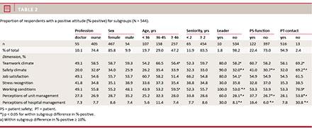two groups of seniority, the within-group difference in %-positive was not statistically significant, but it exceeded ten percentage points. Consistent with literature findings, staff with no patient contact had higher ratings of %-positive than bedside staff did [8-10]. No specific pattern was observed when comparing staff with and without tasks within the patient safety organisation of the unit or hospital. Awareness of variations and clinically relevant differences between subgroups, dimensional strengths and weaknesses may aid leaders and