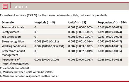 For all dimensions, the variance in means was larger between respondents within the unit (range: 0.017-0.042) than between units within the hospital (range: 0.001-0.007).
