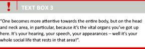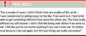 Clearly, being able to eat and drink is associated with the patient’s ability to uphold life and health. Also, when the participants lost their appetite, the capacity to eat and taste, or they could only consume a special diet in peculiar ways, this had a noticeable impact on their social life. Food often had to be cut into tiny bites and taken with large quantities of water; it had to be chewed for a long time (and in some cases noisily) to be swallowed. Hence meeting over coffee, having dinner with friends or a professional lunch became linked to embar- rassment and self-consciousness.