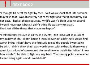 All participants mentioned fatigue and loss of former strength as sequelae of TC that significantly affected their QoL. Many stated they had often felt too feeble to uphold their usual commitments and to enjoy activities giving their life pleasure and meaning such as travelling, going out and doing sports. Most felt they had never entirely regained their former strength.