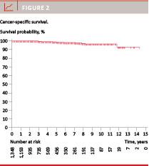 The estimated ten-year overall survival was 89.3% (95% CI: 85.8-92.8), Figure 1. Cancer-specific survival was estimated to 96.6% (95% CI: 94.7-98.5) after ten years of follow-up, Figure 2.