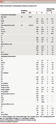 The overall biochemical recurrence-free survival after five and ten years was 72.1% (95% confidence interval (CI): 68.4-75.8) and 64.9% (95% CI: 59.4-70.4), respectively (figure not shown). In all, 59 (4.4%) patients died during follow-up. Seventeen (1.3%) patients died of prostate cancer. The characteristics of patients dying of prostate cancer are listed in Table 2. A high preoperative PSA-concentration (> 20 ng/ml), clinically palpable tumour (≥ cT2) and a biopsy Gleason score ≥ 8 were frequent in patients with prostate cancer death. Young age, extra-capsular extension, presence of positive surgical margins, lymph node-positive disease and a specimen Gleason score ≥ 8 were all associated with prostate cancer death in univariate analysis, Table 1. The low mortality did not allow for multivariate analysis.