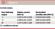 Relative survival after five and ten years, respectively, was 1.038 (95% CI: 1.011-1.057) and 1.138 (95% CI: 1.045-1.186). The five- and ten-year SMR was 0.607 (95% CI: 0.419-0.879) and 0.393 (0.197-0.787), respectively, Table 2.