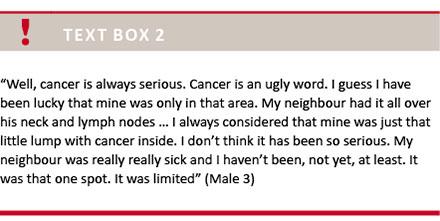 Past experiences with cancer affected the participants’ perceptions of their own disease. Some were frightened by others’ agonising cancer courses. One woman having lost her husband to cancer worried about her children’s reactions and fell into depression. Others considered their AC as less serious and did not want to identify with other cancer patients.