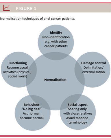 Results: The participants suffered from common sequelae of anal cancer treatment, mainly ano-genital pain, reduced sphincter function and sexual dysfunction. The participants employed a number of “normalisation techniques”, including dissociation from other cancer patients, delimitation of the cancer to a perceived external and peripheral body part and fast resumption of their usual activities.