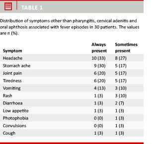 The high prevalence of patients who had associated symptoms (96.8%) other than the characteristic symptoms of PFAPA in the present study underlines the variation in the clinical presentation of the syndrome and the diagnostic challenge it poses. This is supported by the findings of other studies, which found that fever was associated with abdominal pain and headache in 18-65% of patients [5, 7, 10, 12, 13], vomiting in 27-30% [5, 10], diarrhoea in 29-30% and rash in 15-22% of patients [5, 7]. Patients who have prodromal symptoms also cause variation in the clinical presentation. This was the case for 38.7% of the patients in our study population, whereas other studies have reported that as many as 62-78% of cases experienced prodromal symptoms [7, 10].