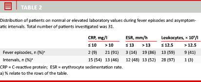 Laboratory results for C-reactive protein (CRP), erythrocyte sedimentation rate (ESR ) and leukocytes were only included if it had been noted whether the blood samples were taken during an asymptomatic interval or a febrile episode. If no such information was available, the result was excluded. Statistical calculations were made using SPSS and included Spearman’s ranked correlation. A p value of < 0.05 was considered significant.