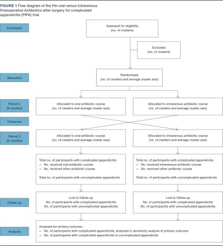 METHODS: The Per oral versus Intravenous Postoperative Antibiotics after surgery for complicated appendicitis (PIPA) trial will be a prospective, multicentre, cluster-randomised cluster-crossover non-inferiority study designed to test whether a three-day post-operative course of oral antibiotics is non-inferior to a three-day post-operative course of intravenous antibiotics as standard care after laparoscopic surgery for complicated appendicitis in regards to the risk of post-operative intra-abdominal abscess formation within 30 days. Participating hospitals will either be randomised to a six-month period with an oral antibiotic regime followed by a six-month period with an intravenous antibiotic regime for the post-operative treatment after laparoscopic surgery for complicated appendicitis, or to a six-month period with an intravenous antibiotic regime followed by a six-month period with an oral antibiotic regime for post-operative treatment after laparoscopic surgery for complicated appendicitis.