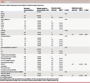 However, the pharmacists’ recommendations are of little value if they are not acknowledged or followed by the physicians. Many factors may influence this. Such factors include the physician’s opinion on the importance of the issue, his or her specialty, the category of recommendations, the patient’s age and the number of drugs. A study from Denmark of acute admissions showed that approximately 34% of the pharmacist reviews resulted in recommendation for changes in medication which were, in turn, taken into account by the physicians in 25-100% of cases depending on the category of recommendations [18]. However, only medical admissions were included and the situation might be different in an ED where patients with surgical, orthopaedic or medical problems are admitted.