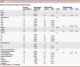 Table 1 shows when the physicians reacted to the recommendations, depending on different variables. The physicians reacted significantly more frequently to a pharmacist’s recommendation made for patients admitted with medical problems than to recommendations made for surgical patients (69% versus 51%, p: 0.002). Recommendations for medication problems that were assessed to be of significant or vital importance were also followed significantly more often than recommendations of lesser importance (67 versus 52%, p: = 0.01). No differences were found in the physicians’ reaction to a recommendation with regard to age, gender, number of drugs per patient, number or category of recommendations. In the multivariate analysis, only the recommendation of the category “untreated indication” and patients admitted with medical problems remained of significance in terms of the physician’s reaction to the pharmacist’s recommendation.