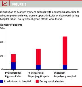 Mortality was quite low in all three groups in the current study, considering that all patients with DT, including those with severe and potentially lethal somatic conditions, were included in the study. As to respiratory complications, the overwhelming majority were caused by pneumonia. In a total of 11 patients (6%), pneumonia was present upon admittance to the hospital rather than being a treatment complication. In the benzodiazepine-treated group, the ratio of patients who developed pneumonia during the delirious reaction to patients with pneumonia upon admittance was higher than in the two phenobarbital groups, although the difference did not reach statistical significance (Figure 2). As the risk of developing pneumonia during DT is increased if pharmacological treatment is insufficient [8, 9], the present distributional findings are compatible with the hypothesis that phenobarbital is more potent than diazepam.