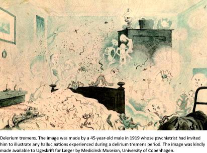 In its full-blown form, delirium tremens (DT) is the most dramatic and serious of complications to alcoholism. The clinical manifestations initially comprise severe physical alcohol withdrawal symptoms such as tremor, sweating, tachycardia, increased temperature and psychomotor agitation all in response to a sufficient decrease in blood alcohol concentration. Within 0-72 hours, the patient becomes visually hallucinated and delirious with insomnia and clouding of consciousness which typically fluctuates markedly over time. Withdrawal seizures are seen in approximately 20% of the patients and typically occur before the patient becomes hallucinated and delirious [1, 2]. DT is a true medical emergency with a 15% mortality rate [2].
