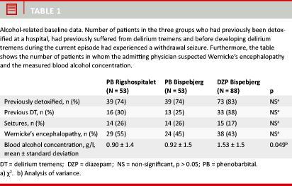 Material and methods: Data were collected retrospectively from the medical files of patients who had received DT treatment (n = 194) at two psychiatric departments located in the general Copenhagen area in the 1998-2006 period. At one department, all patients were treated with phenobarbital (n = 53), while the treatment regimen at the other department was changed from phenobarbital (n = 53) to diazepam (n = 88) in 2002.