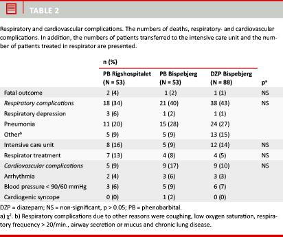 Three patients died during DT, one from each treatment group. All had serious somatic complications, including 1) head trauma, facial fractures, atrial flutter and ketoacidosis, 2) chronic obstructive lung disease and cardiac insufficiency and 3) unstable diabetes mellitus. In addition, one patient from the PB Rigshospitalet group who had developed ileus following DT died after surgery. All patients died from respiratory and cardiovascular insufficiency (Table 2).