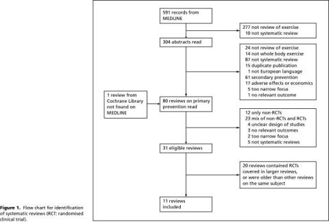We found important effects of exercise. The literature was generally of low quality, however, and there is a need for large randomised trials and for systematic reviews that live up to accepted standards (14-17). Although we restricted our literature searches to systematic reviews published fairly recently, between 1998 and 2004, we had to exclude 102 reviews (Figure 1) that did not fulfil even the most basic requirements for systematic reviews, the existence of a methods section and a search strategy. We excluded an additional 27 reviews because the authors had paid no attention to study design but had mixed randomised trials with observational studies, or had not described the research design. Even in the 11 reviews we included, there were substantial methodological problems, primarily related to lack of quality assessment of the included trials.