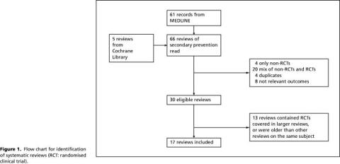 The MEDLINE search resulted in 591 hits (5). We found 61 systematic reviews on secondary prevention of disease, and an additional five from the Cochrane Library alone. We read the full version of the 66 articles and excluded 36 ( Figure 1 ). There were considerable overlaps among the 30 remaining reviews, and we therefore selected 17 that were more comprehensive, i.e. contained more trials or had more information on the trials, or were newer than the others.