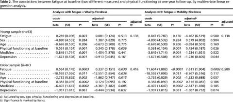 Table 2 shows the associations between fatigue measured by two different measures and physical functioning at one year follow-up - in the young and old study sample. The crude analyses showed that Vitality-Tiredness was significantly related to physical functioning at follow-up in both the young and old sample. In the adjusted analyses the association disappeared in the young sample, but remained significant in the old sample. Mobility-Tiredness was not related to physical functioning in the young sample. In the old sample the association between Mobility-Tiredness and physical functioning at follow-up was strong and significant, also in the adjusted analyses.