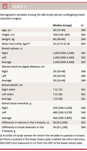 Methods: Included in the study were a total of 366 female patients with breast hypertrophy who underwent bilateral breast reduction surgery at three large university hospitals in Denmark in the period from August 2008 to November 2013. The patients’ height, weight and standard breast measurement were registered as was the weight of breast tissue resection. The preoperative breast volume was measured using transparent plastic cups designed for this purpose.