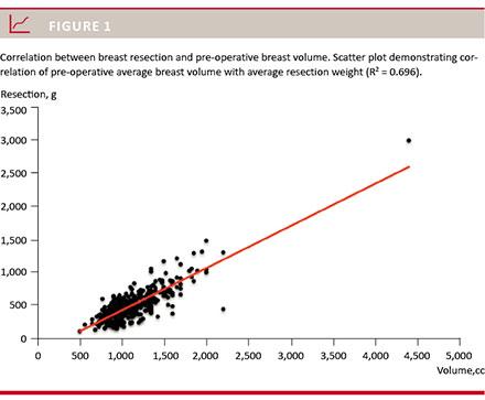 Results: Among the 366 female participants, the median age was 40 years, the median BMI was 24 kg/m2, and the median breast volume was 1,050 cc on each side. Only 201 (55%) cases met the resection criterion of a minimum of 400 g tissue per breast, and 130 (36%) had 500 g or more resected. We found a highly significant correlation between the amount of resected breast tissue and the preoperative breast volume (p < 0.001, n = 366).