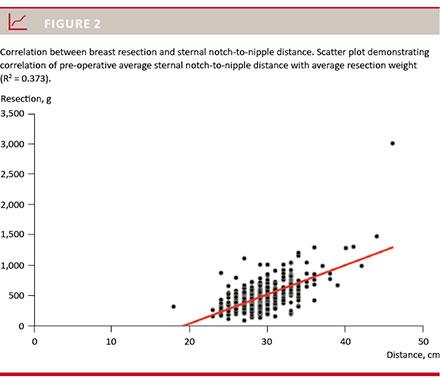 We found a strong correlation between breast volume and weight of resected breast tissue (p < 0.001) (Figure 1). The correlation between the weight of the resected breast tissue and sternal NND was also statistically significant (p < 0.001) (Figure 2).