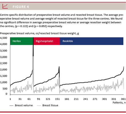The Kruskal-Wallis test was performed to examine a possible difference between the three centres in terms of: 1) meeting the resection criteria and 2) difference in preoperative breast volume and resected breast tissue weight.