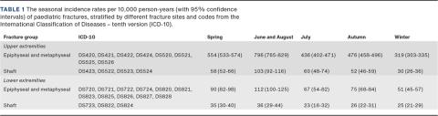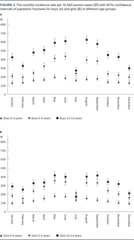 RESULTS We recorded a significant increase in IR in spring and summer, except for a drop in July. For boys, the IR ranged from 206 in December to 404 per 10,000 person-years in June. For girls, the incidence ranged from 156 in December to 317 in May. Fractures were more frequent in the upper extremities and were up to six-fold more frequent in the epiphysis and metaphysis than in the shafts. All fracture sites showed a peak in spring and summer, suggesting that all fracture sites are subject to seasonal variation, especially the ones near the epiphysis.