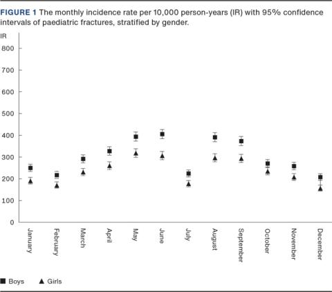 METHODS We extracted data from the existing emergency room register at Odense University Hospital and included all fractures sustained by children aged 0-14 years and living in Odense Municipality. Seasonal and monthly IR were calculated using population counts stratified by age, gender and fracture site.