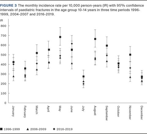 INTRODUCTION Few Scandinavian studies have studied seasonal variations in paediatric fractures, and the studies that have focused on individual fracture sites. Furthermore, their findings do not coincide as they have described peaks in different seasons. Therefore, we described seasonal variation in the incidence rate (IR) of all paediatric fractures in the 1996-2019 period within a Danish population.