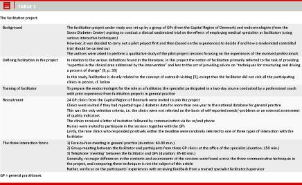 This article focuses on a facilitator project (see Table 1) in which a medical specialist (endocrinologist) acted as a facilitator for quality improvement in general practice on the basis of standardized data on clinical quality. The issue of medical specialists acting as facilitators in general practice is important to explore for at least two reasons. Firstly, the transfer of knowledge between secondary and primary care is usually considered an important means to improve the quality of chronic care, and in many health care systems there is a growing interest in supporting collaborative arrangements between hospitals and general practice [10-12]. Secondly, educational interaction between hospital-based specialists and GPs has traditionally been sparsely researched [13], and only few studies have been published in which medical specialists attempt to facilitate learning from quality data. An exception to this is Smith et al 2008 [14], who report on a telemedicine intervention where endocrinologists provided e-mail feedback on patient data to GPs. In the present article, we present the findings from a qualitative study of the above-mentioned facilitation project which was carried out in 2010. The purpose of the article is to articulate the experiences and assessments of the GPs and nurses participating in the facilitation sessions.