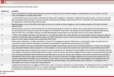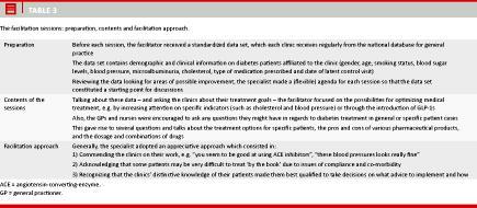 During the learning sessions, very few explicit disagreements arose between the facilitator and the professionals from general practice. The interviews subsequently confirmed that the GPs and nurses had mostly agreed with the specialist concerning the goals and means of diabetes treatment (Table 4, Q3, Q4). The few differences noted by the participants were primarily attributed to the different contexts of care of the (hos- pital-based) facilitator and the participants from gen- eral practice. Particularly, in some cases, the continuity of care in general practice seemed to promote a less ‘‘aggressive’’ pharmacological approach than that generally favoured by the specialist (Table 4, Q5, Q6).
