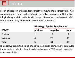 Data collection was carried out retrospectively. Since radical pelvic lymphadenectomy (PL) is still regarded the true confirmation of PET-positive findings and due to the biopsy criteria given above, PPV and NPV was only calculated for patients with stage Ia2 and Ib who had PL.