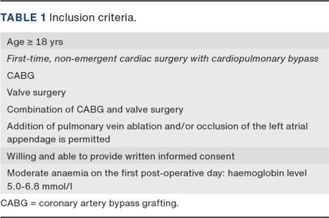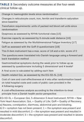 All patients are scheduled for a clinical follow-up visit four weeks after randomisation. Outcome assessors are blinded to treatment allocation. The primary outcome measure is defined as the proportion of participants at the four-week follow-up who are neither anaemic nor have received allogeneic red blood cells since randomisation. Post-operative anaemia is defined as haemoglobin < 8.1 mmol/l in men and < 7.5 mmol/l in women.