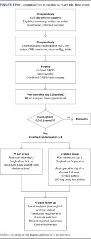 INTRODUCTION. Anaemia is common after cardiac surgery and has a negative impact on rehabilitation and patient well-being. We aim to compare the efficacy of single, high-dose intravenous iron therapy versus oral iron supplementation to correct anaemia following open cardiac surgery.