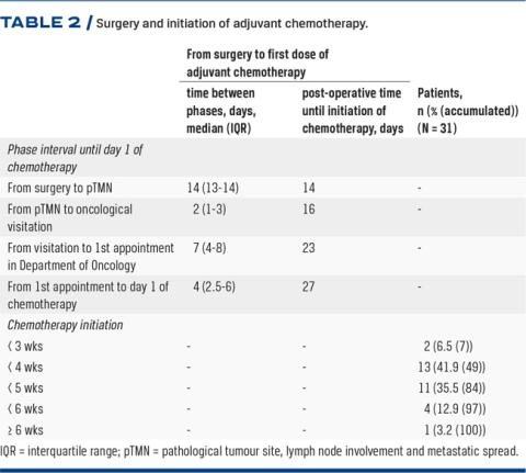Parameters regarding the course of the patient treatment can be seen in Table 2. A total of 15 patients (48%) received the first dose of chemotherapy within post-operative week four. At five weeks, 26 of the patients had their first AC treatment, and the remaining patients (n = 5) had their AC within seven weeks (Table 2). In all, 21 (68%) patients completed their AC as planned; among these, 13 (42%) received treatment within four weeks.We found seven days (IQR: 4-8 days) of waiting from referral to the Department of Oncology to first consultation was found. Delay from first consultation to first dose of chemotherapy was four days (IQR: 2.5-6 days).