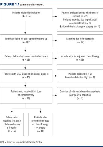 RESULTS: A total of 115 patients were included between October 2016 and May 2017. Among these, 20 patients were excluded. Hence, 95 patients were followed up as uncomplicated cases. The median length of stay was three days (interquartile range: 2-4). A total of 40 patients were referred for oncological evaluation, but nine patients did not proceed to receive AC. Among the 31 patients starting AC, 48% (n = 15) received AC < 4 weeks and 52% (n = 16) > 4 weeks. No significant difference was seen in post-operative quality of recovery, either when investigating the full cohort or subgroups of patients who initiated AC before and after four weeks.