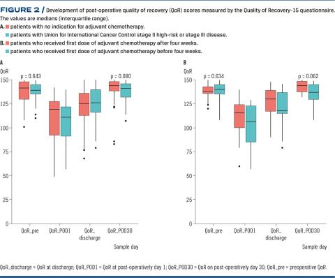 In conclusion, our study has shown that post-operative recovery may not be an important limiting factor for patients receiving adjuvant chemotherapy either before or after post-operative week four measured by the QoR-15 questionnaire.