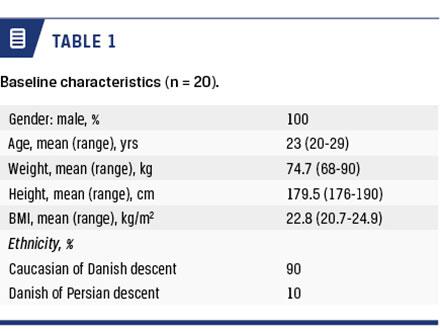 A total of 20 non-smoking, healthy males with no previous medical history aged 20-30 years participated in this study. All participants gave their written informed consent, and the study protocol conforms to the ethical guidelines of the 1975 Declaration of Helsinki. The Danish National Committee on Biomedical Research Ethics and the Danish Data Protection Agency approved the study (identification number H-15011038).