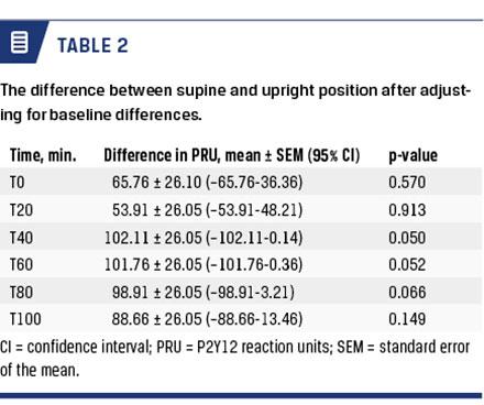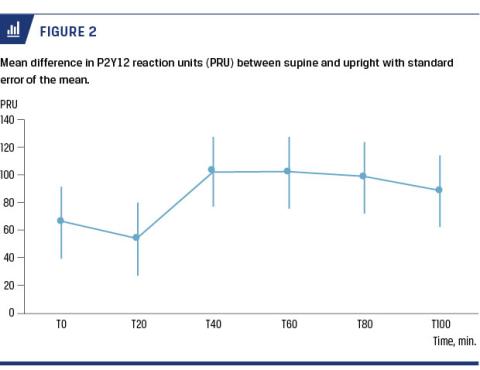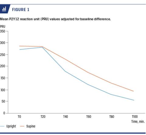 Results: In the upright position, the velocity of platelet inhibition was highest between 20 and 40 min. (Δ = 101.9 P2Y12 reaction units (PRU)). In the supine position, the highest value was seen between 40 and 60 min. (Δ = 56.85 PRU). Time to reach the cut-off for reducing peri- and post-operative risk of thrombosis showed a mean difference of 8 min. in favour of the upright group.