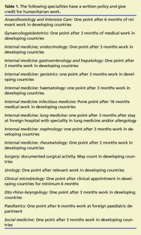 There is, however, a need for standardised guidelines concerning specialist organisations' ways of crediting humanitarian work for specialist training. In this context, it could be useful if the National Board of Health in cooperation with specialist organisations formulated clear-cut guidelines for transfer of credits for humanitarian work. Table 1