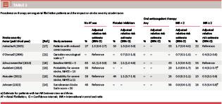 The proportion of patients on preadmission AT differed between the studies. The proportion, which did not receive any AT before admission, ranged from 22 to 75%. The proportion of patients receiving platelet inhibitors ranged from 25 to 43%, and the proportion receiving any OAT on admission varied from 14 to 37%. The proportion of patients in adequate OAT treatment, with an INR ≥ 2, ranged from 3 to 16%.