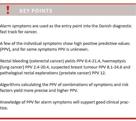 Original studies in English or Danish using an unselected population from general practice with a newly recognised alarm symptom were included. The studies had to have positive predictive values (PPV) or likelihood-ratios (LR) for any of the alarm symptoms included in the guidance from the Danish Health and Medicines Authority. The PPV is expressed as the percentage of patients with a given symptom who actually have cancer.